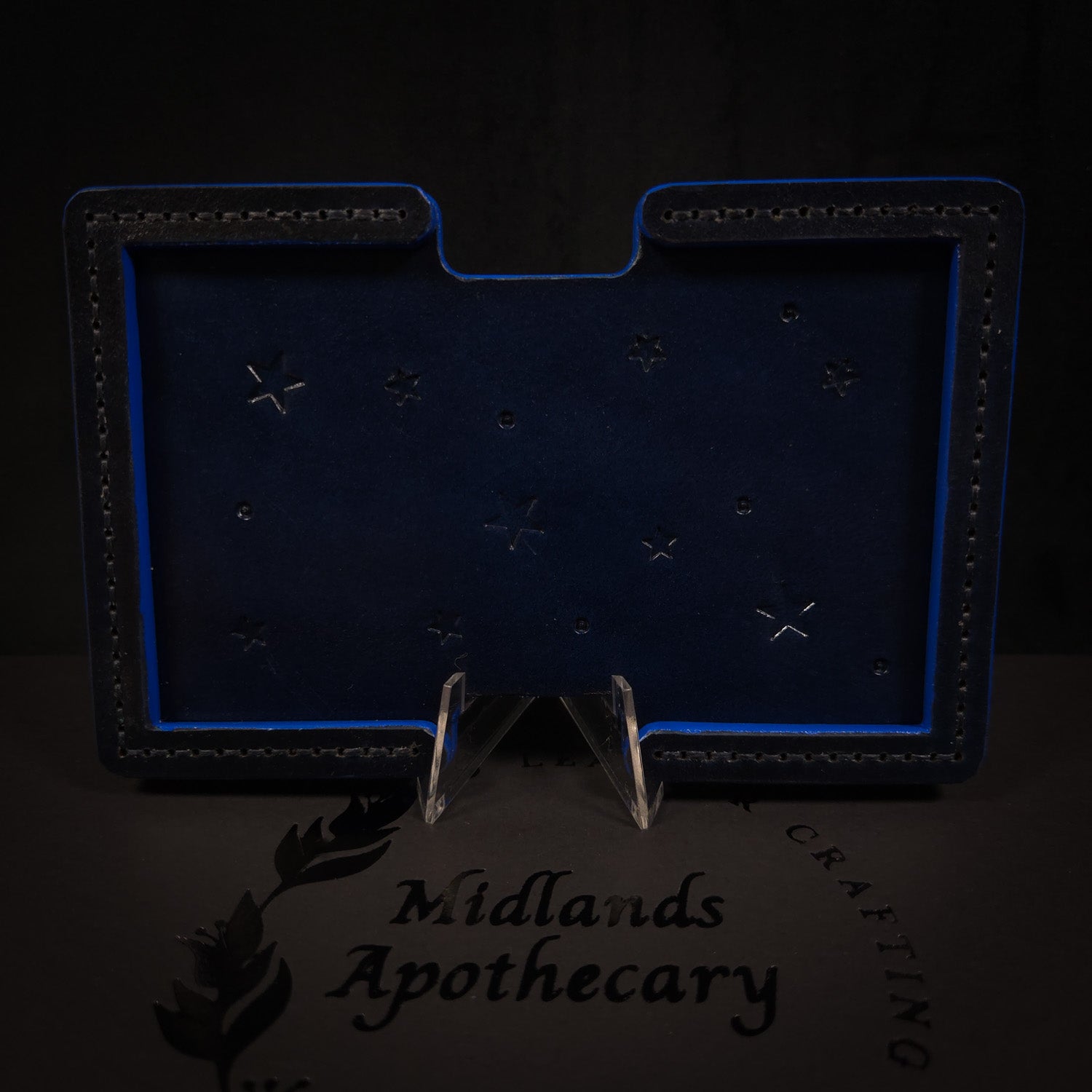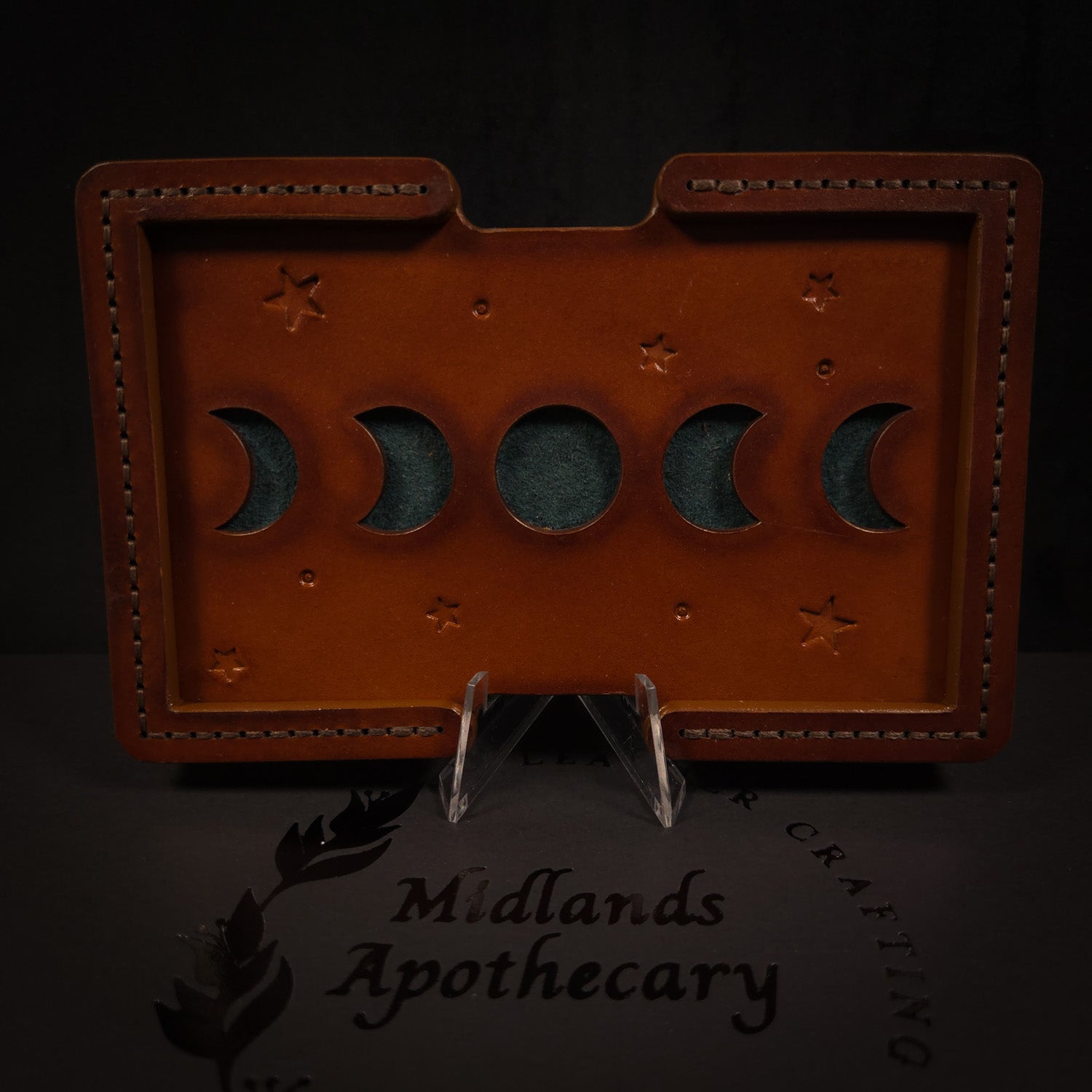 The reverse side features full-grain 5oz (2.5mm) vegetable-tanned leather, also finished to complement the front. I've embossed it with the Midlands Apothecary logo, adding a personal and authentic touch to the stand. This is also one of the rare pieces where I have included feet to help the piece stand slightly proud of the table.