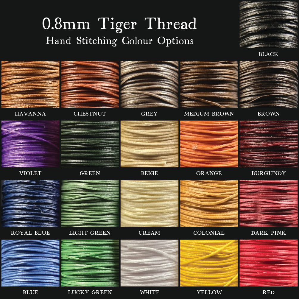 Each piece is then adhered along the edges using water-based contact adhesive. Once dry, the holes for the thread are punched into the leather. The thread is then hand-stitched using 0.8mm Tiger Thread.
