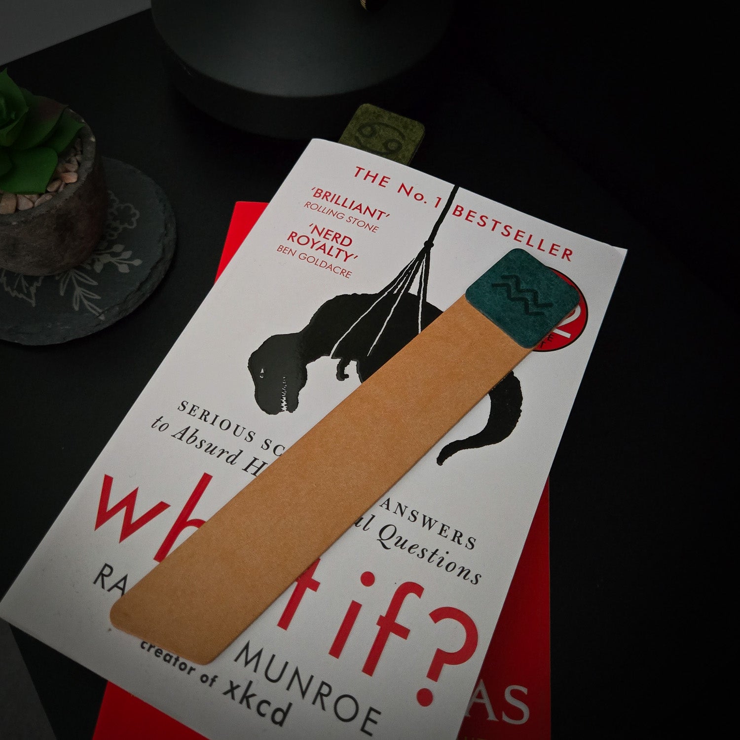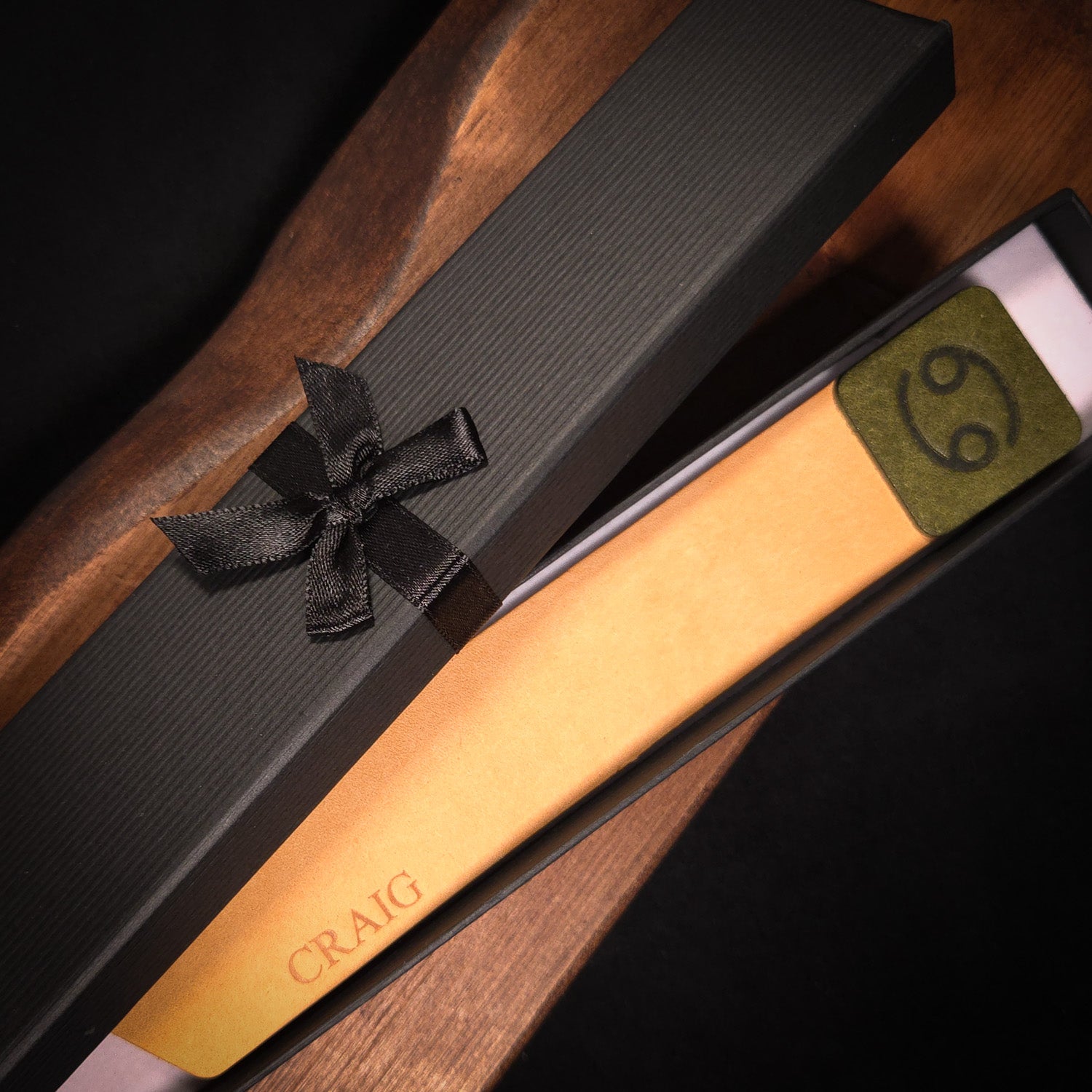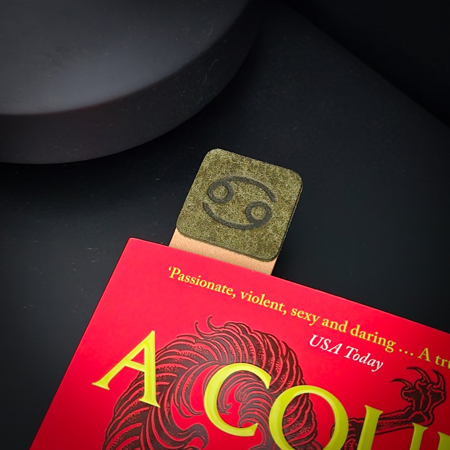 The bookmark features a zodiac symbol on the header, which can also be personalised with debossed initials or a name that runs up the side.